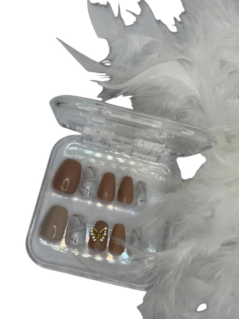 Une manucure élégante et intemporelle, qui allie la douceur du nude, la finesse du marbré blanc et une touche de luxe doré avec son papillon scintillant. Parfaite pour un look chic et sophistiqué.