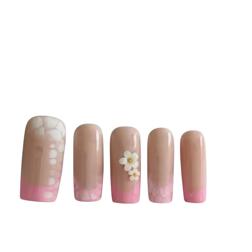 Une manucure douce et raffinée qui allie la délicatesse du nude élégant et la fraîcheur d’un rose pastel lumineux. Sublimée par de petites fleurs en 3D, elle apporte une touche romantique et féminine, idéale pour toutes les occasions.