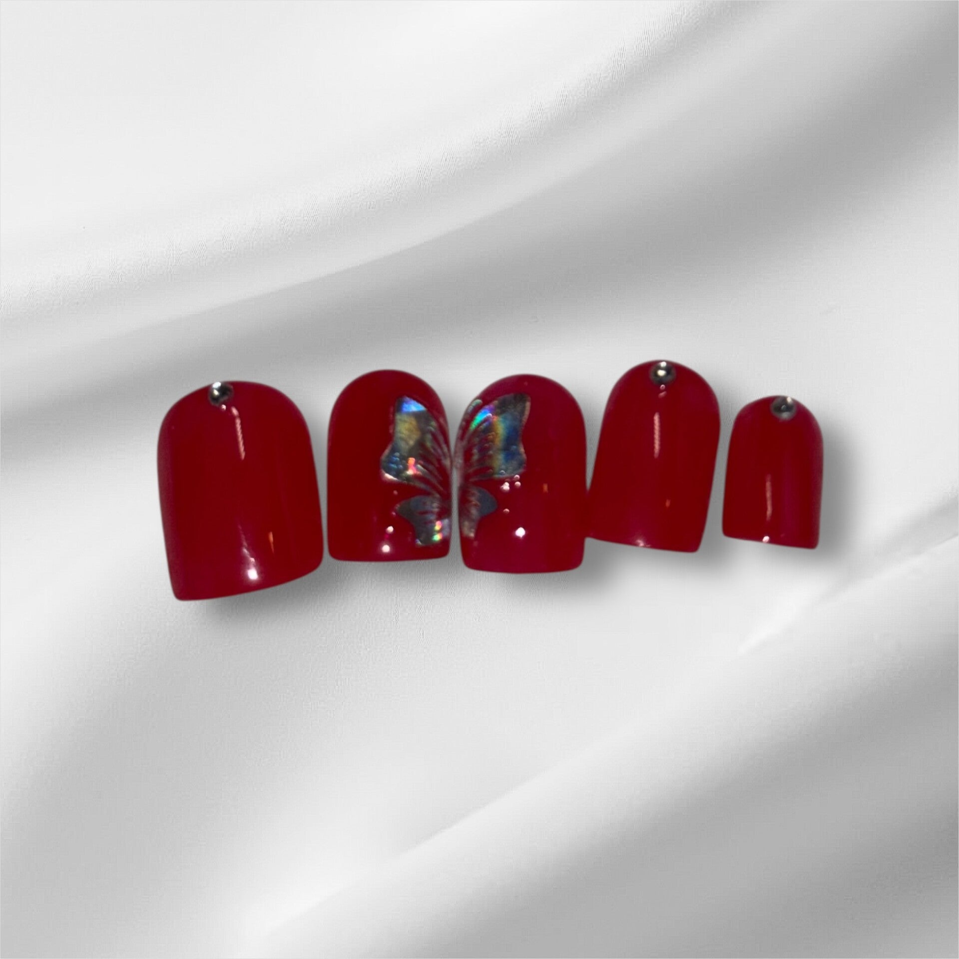 Plonge dans l’élégance avec Red Butterfly Glam, un set de press-on nails au rouge profond et intense. Un design sophistiqué avec des strass délicats et un papillon holographique qui capte la lumière pour un effet chic et tendance.