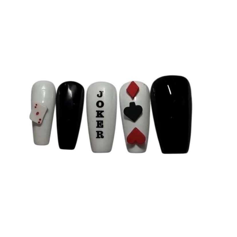 Un design audacieux inspiré du monde du casino et des cartes à jouer. On retrouve les symboles iconiques – pique, cœur, carreau, trèfle – en relief rouge et noir, un effet 3D sur l’ongle “carte”, et une touche originale avec le mot JOKER en lettres noires. Une manucure unique qui mélange style chic et esprit joueur, parfaite pour celles qui aiment se démarquer.