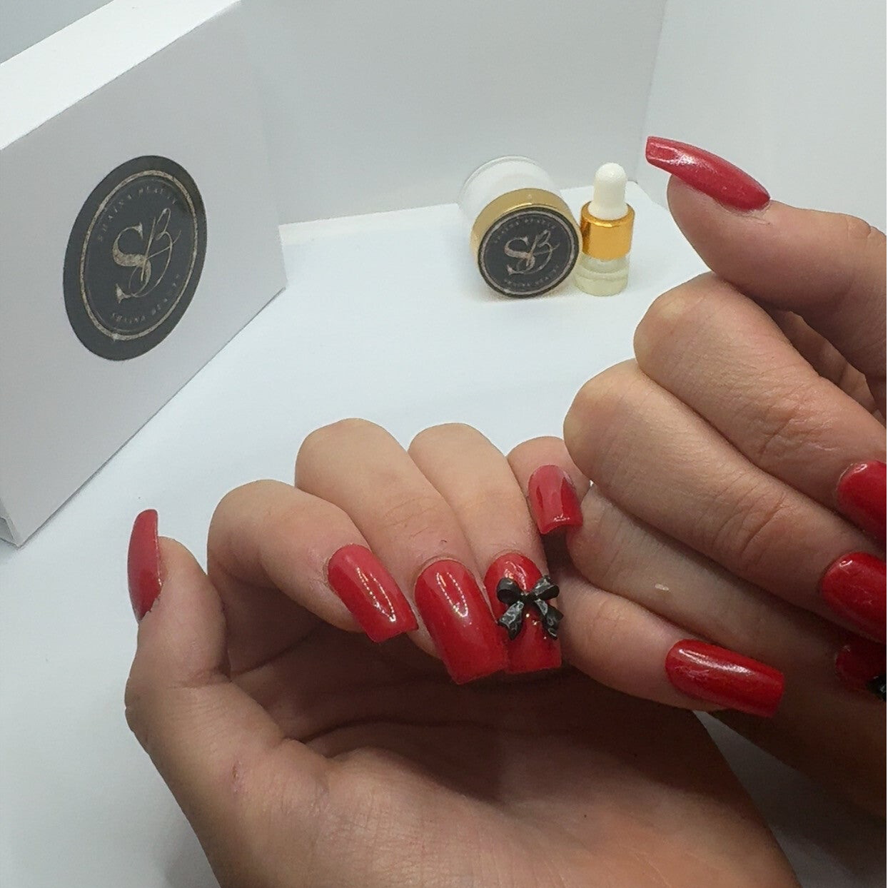 Un rouge intense et brillant qui incarne la passion et la confiance. Chaque capsule est soigneusement façonnée pour un rendu effet salon. L’accent nail est sublimé par un délicat nœud noir, ajoutant une touche chic et sophistiquée. Parfait pour celles qui veulent des ongles élégants, audacieux et féminins en toute occasion.