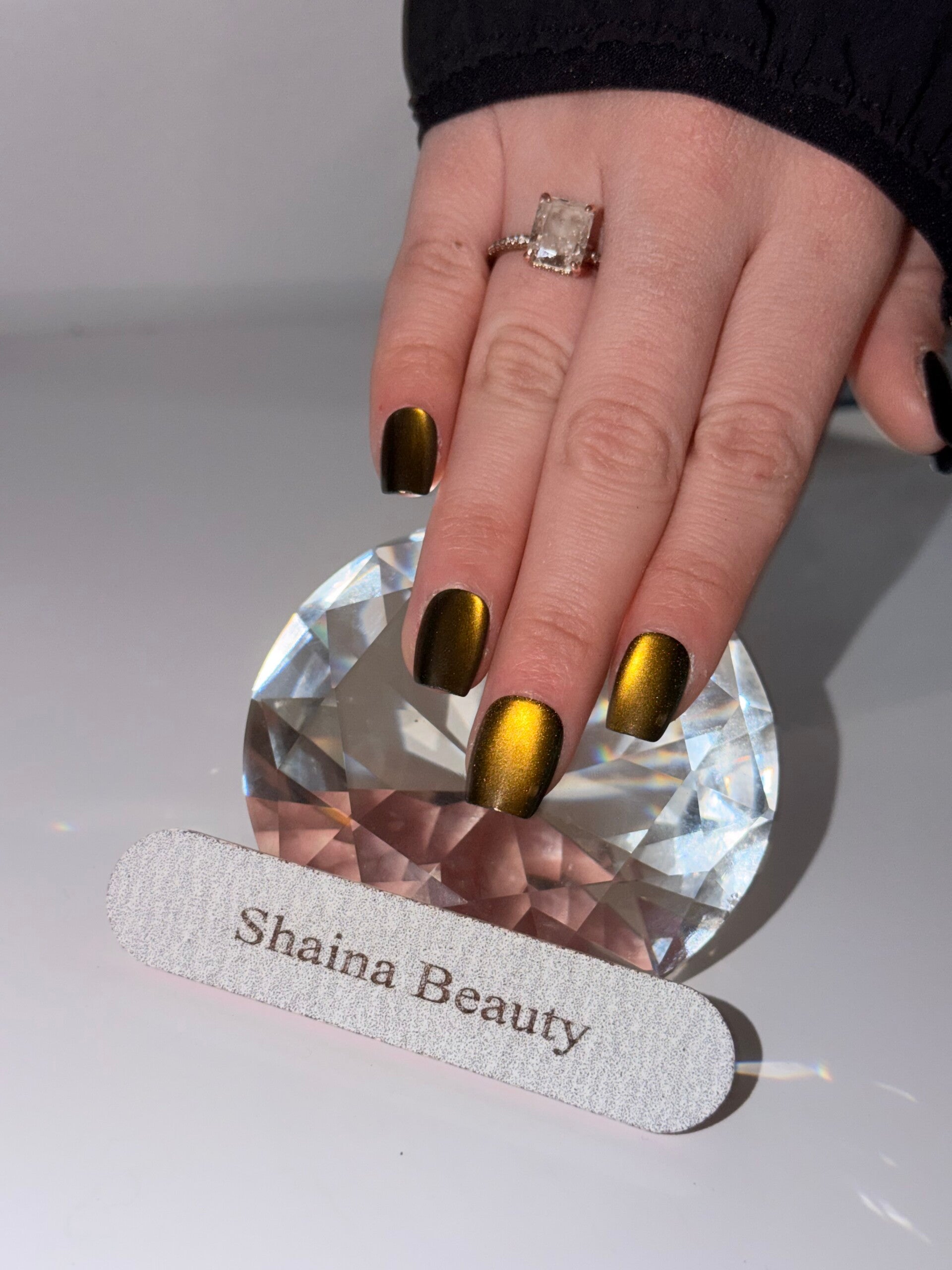 Une pose intense, magnétique, au fini or profond.